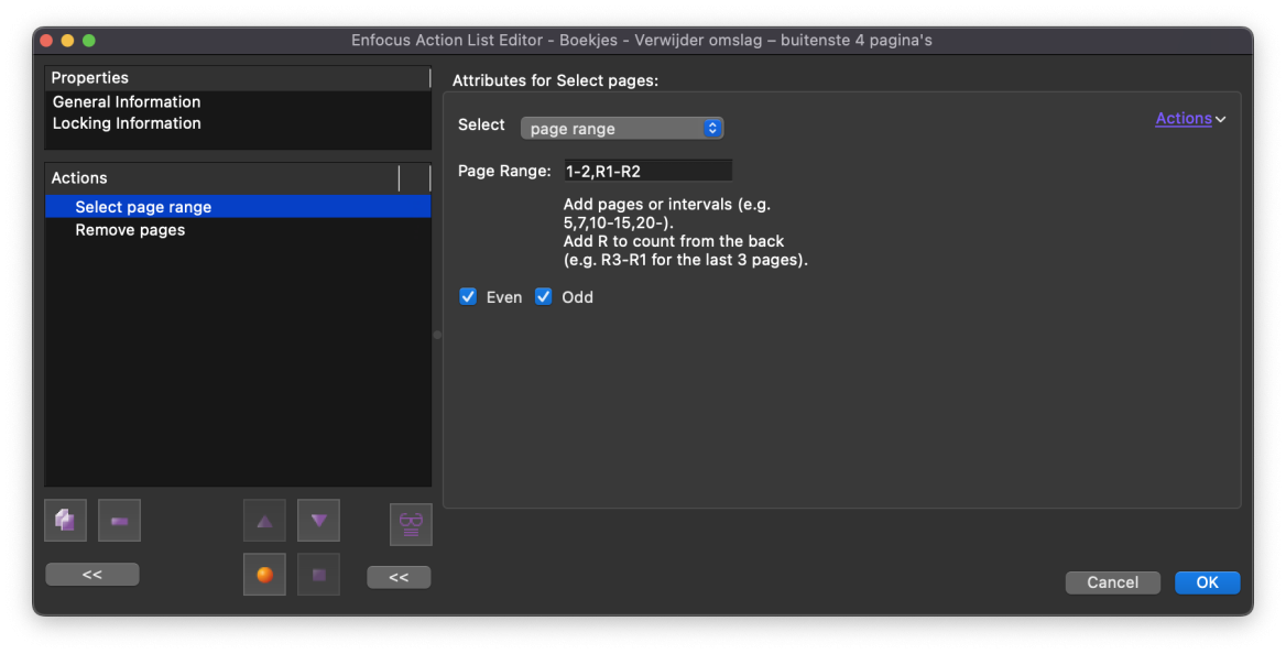 Maak in PitStop de action voor het binnenwerk. In de eerst stap kiezen we voor ‘Page Range: 1-2,R1-R2’. De R staat voor ‘Reverse’, de laatste twee pagina’s. De tweede stap verwijdert de selectie.