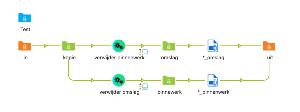 Bij de uitgaande connecties hernoemen we de bestanden door er ‘_omslag’ en ‘_binnenwerk’ achter te zetten. We kiezen voor ‘Add suffix’ die ‘Act on: Filename proper’ (bestand zonder extensie) en ‘Suffix: _omslag / _binnenwerk’. Zo worden ze niet overschreven en zijn ze eenvoudig uit elkaar te houden. Als het goed is moet alles werken. Probeer het maar!